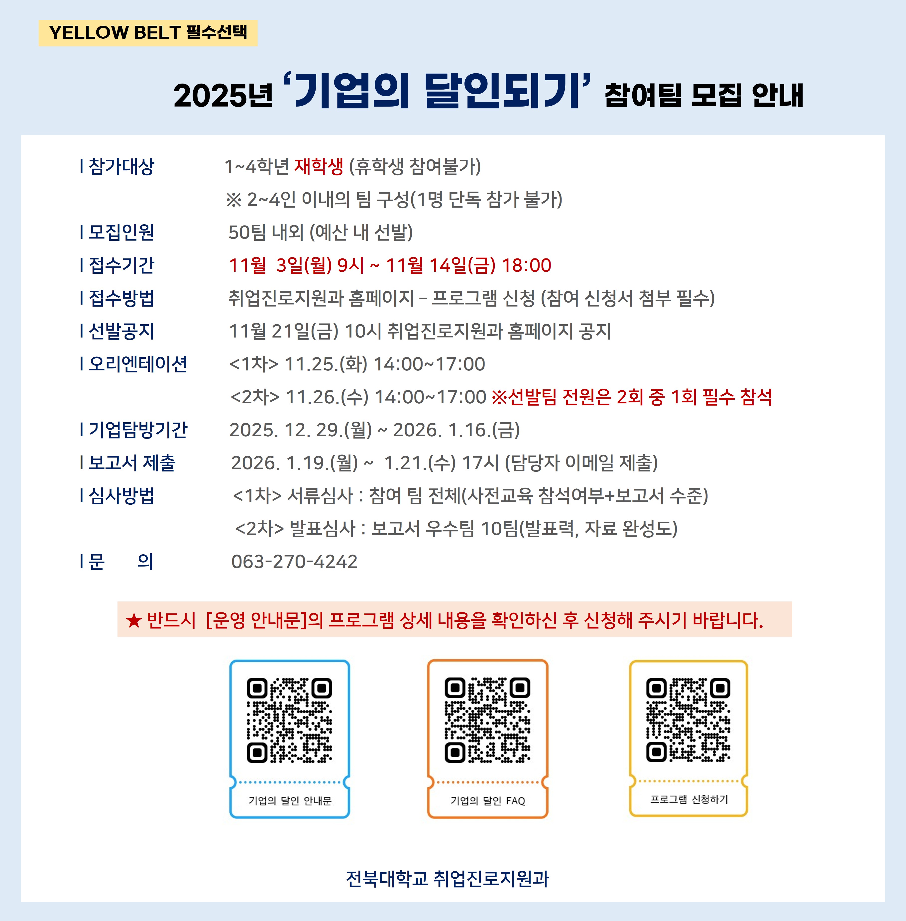 학생들의 취업 목표설정을 지원하기 위하여 운영하는 2025년 동계 자기주도적 기업탐방 프로그램(기업의 달인되기)을 안내드립니다.